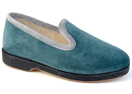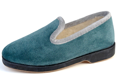 Pantoufles pour femmes dessus en velours unie vert et sont lisserais gris, semelles épaisses en caoutchouc multicouches. Pantoufle charentaise pour femme chaude pour l’intérieur ou l’extérieur de votre maison, chausson confortable intérieur fourré 100 % pure laine, pantoufles dessus tissus velours résistants et fibres résistantes, pantoufles femmes semelles souples et isolantes.