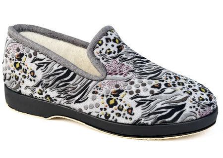 Pantoufle charentaise pour femme fantaisie avec semelle épaisse isolante en caoutchouc multicouches, pantoufles charentaises colorie tissus fantaisie gris. L’original est authentique chausson charentaise de OUF de la marque OUF chaude pour une utilisation intérieur ou extérieur. Chaussons charentaises doublures fourrées 100 % pure laine dessus tissus velours résistants semelles souples et légères . Ces pantoufles fantaisie avec un petit talon vous garantissent du confort et de la douceur tout au long de l’hiver.
